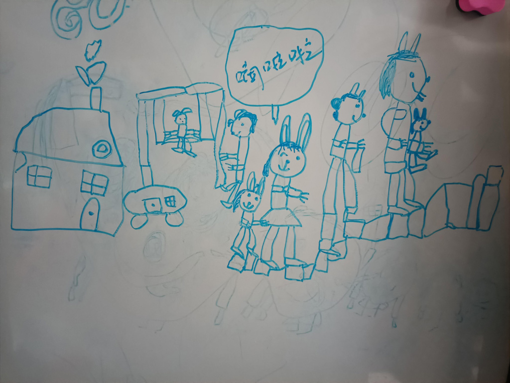 兔子爸爸、妈妈、妹妹、姐姐和哥哥出去玩;狗妈妈让小狗荡秋千;兔子的姥姥、姥爷在家做饭,烟囱冒着烟。兔子姐姐唱着歌:“滴啦啦,滴啦啦……”(滴啦啦是让爸爸给写的)