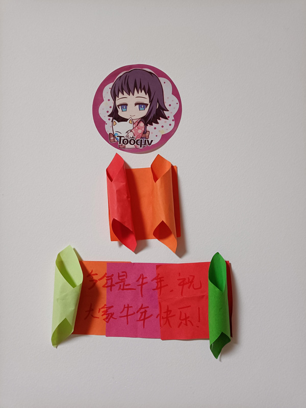 星鹭今天表示,快过年了,要把家里装点的漂漂亮亮。这是星鹭自己做的手工,又自己贴到墙上,并让爸爸给写上:“今年是牛年,祝大家牛年快乐!”
